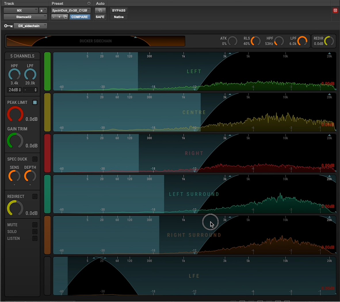 Stemcell 2は、LPF、HPF、リミッター、ゲイン、スペクトラルダッカ―を備えたマルチチャンネルプロセッサーであり、サラウンドステムの各チャンネルごとに独立したフィルターコントロールを提供します。