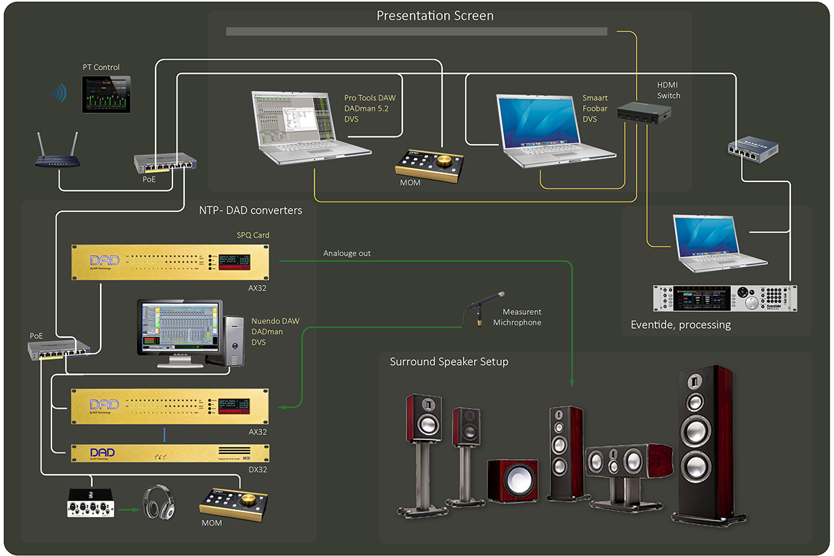 MOMは、PRO | MON | 3モニタ・コントロール・ライセンスを搭載した1台及び複数台のAX32およびDX32R、もしくはAvid/MTRXに最適なモニター・コントローラーです。 MOMはイーサネットを介して接続されたリモート・コントローラーで、ユニットにオーディオ信号は流れません。オーディオのルーティングはAX32またはDX32R、もしくはAvid/MTRX内で行われ、それはDADmanソフトウェアを介して設定されます。 しかし、一旦MOMに接続すると、これらは指先でコントロールすることができます。